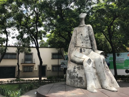 Postrado sobre una piedra, las manos en descanso sobre ésta, la figura de un hombre mantiene su rostro (un rostro plano, inexpresivo, informe y vago) extraviado en algún punto que trasciende los árboles y los edificios que lo rodean. Lo que mira, sin embargo, está más allá de las nubes que cercan estos días el cielo de lo que alguna vez fue llamado la gran Tenochtitlan. Se halla en el infinito, en el universo, en el multiverso o en todo –nunca mejor dicho– eso junto.